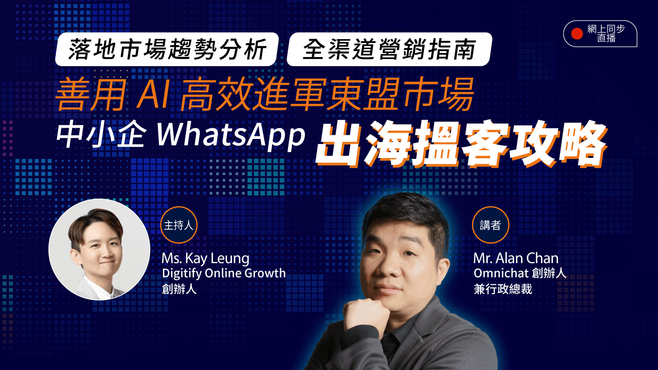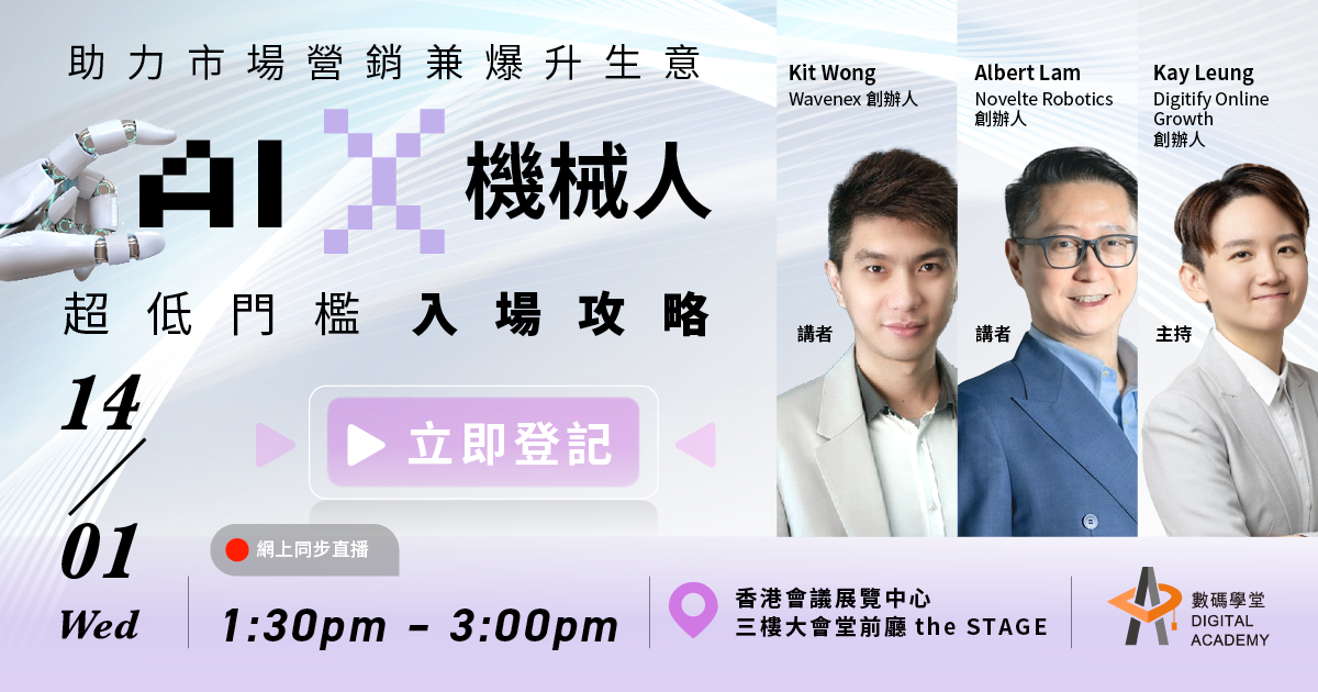 Digital Academy landing 首頁 關於數碼學堂 節目重溫 學員分享 最新活動 發掘更多商機 首頁 關於數碼學堂 節目重溫 學員分享 最新活動 發掘更多商機 日期 2026年1月14日(星期三)時間 01:30pm – 03:00pm語言 廣東話形式 現場參與+Zoom網上直播 地點 香港會議展覽中心3樓大會堂前廳 the STAGE立即登記 中小企老闆最頭痛的三大難題:人手不足、成本上升、客戶要求越來越高。競爭越來越激烈,如何突圍而出?競爭對手已開始部署AI與機械人技術搶佔市場先機,中小企如何在有限資源下快速入場追落後? 本月「數碼學堂」邀請了兩位業界頂尖專家,分享如何使用製圖、寫文章以外的進階AI技術,以及如何選擇適合的機械人方案,助你提升營銷效率,拓展海外市場。 同場亦會為大家講解貿發局的「展覽+」(EXHIBITION+)融合展覽模式,助大家延續推廣優勢,發揮線上線下協同效應,捉緊每個商機。參加者可即場發問,與專家現場交流及聽取專業意見,亦可於會後與業內人士及到場專家交流分享。 活動將於香港會議展覽中心3樓大會堂前廳「the STAGE」舉行,設於「香港玩具展」、「香港嬰兒用品展」,及「香港國際文具及學習用品展」展場內,誠意推薦各位於活動前後,蒞臨參觀上述展覽,發掘創新產品、接觸業界翹楚、採購優質產品! 現場座位有限,名額先到先得,成功報名者將獲發確認函通知。研討會亦會進行網上同步直播,方便未能親身到場的朋友了解最新市場資訊。 內容:2026中小企必知AI趨勢 AI進階應用:市場調研及營銷 自動化、AI Agent用得未? 常見中小企機械人應用場景 中小企低門檻機械人方案 玩具及嬰兒用品業案例分享及現場問答 講者:Mr. Kit WongWavenex 創辦人Kit 擁有超過15年的豐富資歷,專精於網站平台與雲端應用程式開發、數碼營銷策略規劃及專案管理。他致力透過創新解決方案與專業顧問服務,協助企業運用人工智能提升營運效能,並提供相關培訓以深化應用能力。作為生產力學院的特約講師,Kit 定期舉辦內容扎實的生成式人工智能(Generative AI)研討會及工作坊,以深入淺出的方式分享專業知識。他曾為多個政府部門、物業管理公司、銀行及金融機構設計並執行具影響力的培訓計劃,並以其互動性強的教學風格,確保學員能有效將所學應用於實務工作中。 講者:Mr. Albert LamNovelte Robotics 創辦人林智祥先生作為人工智慧產業領軍者,現任智慧機械人企業諾達科技(Novelte Robotics)創始人及香港科技園創科協會主席,長期致力於推動AI技術與產業融合創新。 憑藉其跨領域戰略視野,主導構建智慧機械人領域的AI技術應用體系,賦能集團在金融科技與智慧城市建設的可持續發展; 同時通過香港理工大學客席講師、香港大學數據與系統工程系顧問委員等產學研紐帶,深度協同高校科研資源與產業實踐。 林先生兼具國際專業認證(可持續發展規劃師 CSDP)與公共事務影響力(香港專業人士協會副理事長),整合粵港澳大灣區科技生態網路,持續推動技術創新與社會價值共創。 主持:Ms. Kay LeungDigitify Online Growth 創辦人Kay是Digitify Online Growth的創辦人,電商營銷專家,精通不同網店平台,擅長為客戶提供最適合的電商解決方案、網店設計及優化,以及協助品牌將產品推廣至東南亞市場。此外Kay亦是香港物流協會電商物流籌委會成員,協助協會籌劃不同電商營銷策略及AI相關之講座。 節目重溫 中小企WhatsApp出海搵客攻略善用AI高效進軍東盟市場想進軍東盟市場,但客戶溝通效率低下、推廣成本高企、銷售轉化不如預期、甚至不懂選擇合適的行銷平台?Omnichat創辦人及行政總裁Alan Chan,為你深入剖析AI即時通訊最新趨勢,教授如何建立客服、行銷與銷售流程,更會分享實戰案例。 AI操作入門系列由零生成簡報生成式AI功能五花八門,發展亦已趨向成熟,對於中小企來說,市場上有甚麼實用又免費的工具,可以即學即用,令生產力大大提升?數碼學堂請來Innopage創辦人Keith Li,一連四集為大家示範講解,手把手教你用。 市場熱門影片平台趨勢分享2025中小企短片製作攻略短片頭2秒已決定成敗?如何解讀YouTube趨勢,找出製作高效影片心得?負責YouTube客戶營運的Google Customer Solutions高級客戶經理Alan Ng,以及內容營銷達人Samson Fong,為大家一一剖析。 廣告界大宗師牽頭中小企網上營銷精英班中小企在資源緊絀,但競爭愈來愈激烈的情況下,你的產品服務再好,無人認識等於白做一場。廣告界宗師,The Bees創辦人KK Tsang,以及網上營銷文案鬼才,Durian HK創辦人鍾梓淳,現場分享中小企如何用最低成本,帶來最好曝光效果! 查看更多 香港貿發局主辦「數碼學堂」(Digital Academy),邀請各方面的網上推廣專家,為你提供全面而實用的免費數碼營銷培訓課程,從網絡行銷到電子營商秘訣都一應俱全,讓中小企就算從零開始,也能隨時隨地自學並增進各種不可或缺的數碼知識。 140+免費課程 30,000+學員人數 40+星級導師 2,000+研討會平均登記人數