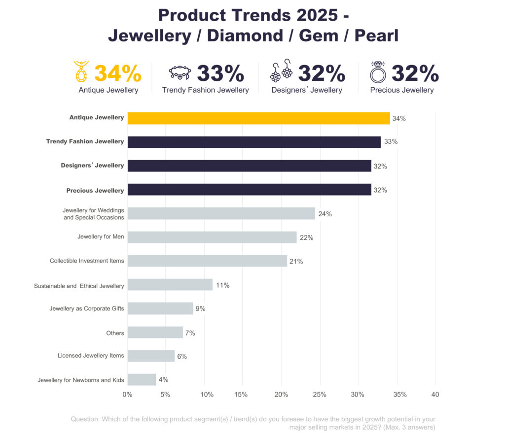 Demand in this category is highly diverse, with antique jewellery drawing the most interest, followed closely by trendy and designer pieces. Precious jewellery is also experiencing strong demand, reflecting a broad spectrum of consumer preferences that blend tradition with contemporary styles.