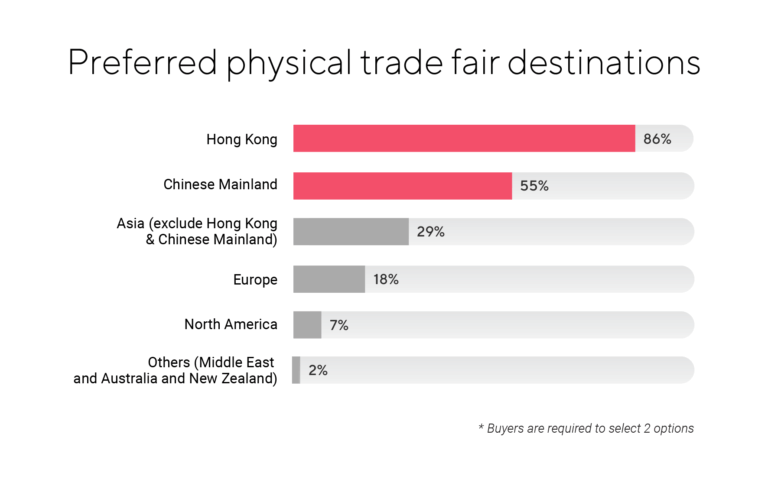 According to the survey, Hong Kong and Chinese Mainland are the top physical trade fair destinations for most buyers, counting 86% and 55% respectively. As one of the major international trade hubs, Hong Kong continues to be a popular destination for buyers due to its convenient location, world-class facilities, and reputation for hosting top-quality trade fairs.