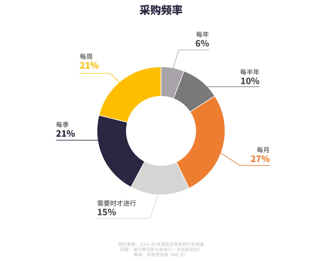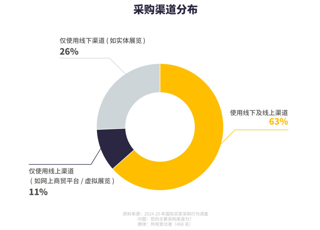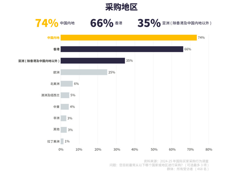 综上,在多方因素影响下,采购格局正发生着变化,传统渠道加速线上化调整,采购周期更加灵活,人工智能等新兴技术也激发了新型产品服务的蓬勃发展。亚洲市场和欧洲市场依旧是强劲的采购目的地。在此环境下,具体产品类别和采购趋势有着怎样的发展?更多详情请见《2025年国际买家采购行为调查:动荡时期的战略采购(下)》。