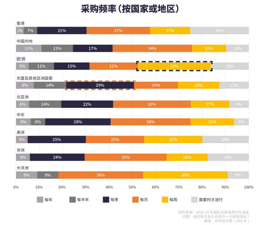 虽然全球范围内更多买家倾向于按月采购,但各区域的采购模式偏好差异仍然很大。受制于对价格的高敏感程度和忧虑目前不稳定经济状况所带来的影响,欧洲买家表现出对更频繁采购模式的强烈偏好,32%的买家选择每周订购。这一模式让他们能够在寻求更优惠的交易、管理预算限制和适应当下趋势时,保持良好的应变能力。相比之下,来自东盟和亚洲其他地区的买家更偏好按季度下订单,尤其会优先考虑供应的稳定性、供应商的信誉和长期合作关系。