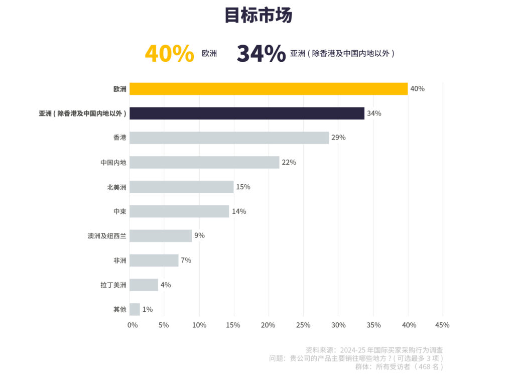 欧洲仍然是40%受访企业的首选地区,但亚洲快速扩张的经济正日益引起关注,34%的受访者将亚洲列为优先考虑的对象。随着城市化加速和数字化接受度提升,亚洲庞大的消费群体不断增长,加上可支配收入上升和的电子商务行业蓬勃发展,大众对不同产品的需求也越来越广泛。