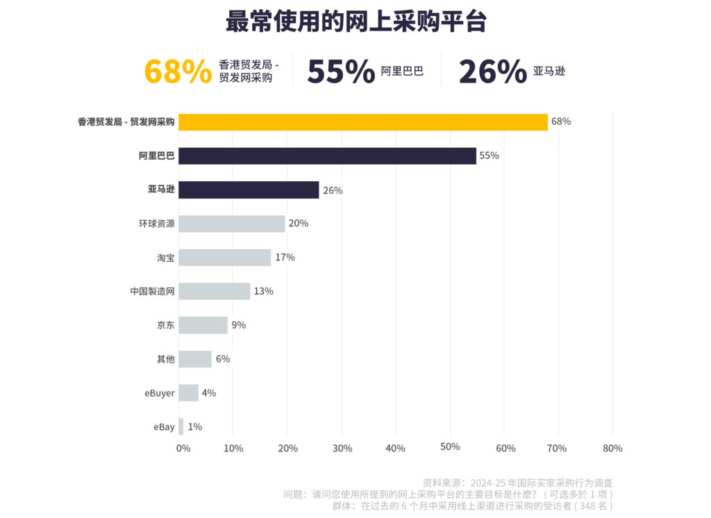 随着采购活动逐渐向线上转移,香港贸发局的贸发网采购平台成为68%受访买家的首选,其次是阿里巴巴(55%)、亚马逊(26%)和环球资源(20%)。香港贸发局在实体贸易展会的强大影响力,进一步巩固了贸发网采购平台作为可信赖采购渠道的地位,提供全年无缝的线上到线下体验。贸发网采购平台及其他平台的成功,突显了线上买家基于其具体采购需求的多样化偏好。值得注意的是,买家倾向于多元化采购策略,当中许多买家会根据各平台的产品优势,选择同时使用多个平台。