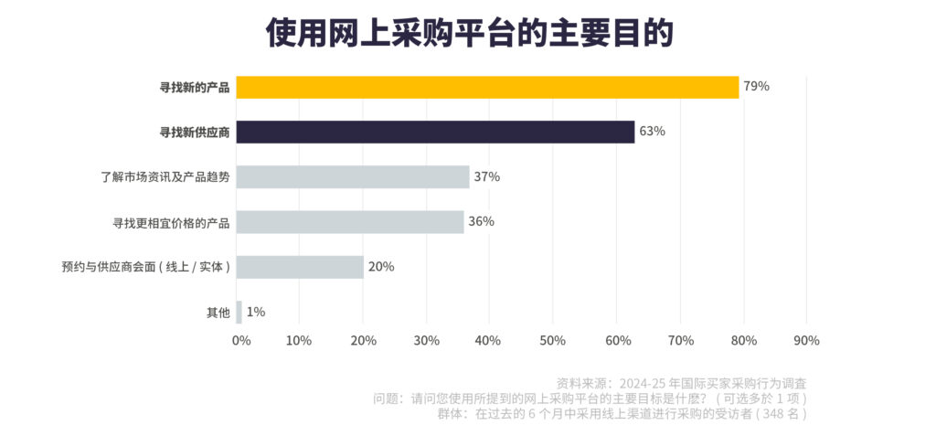 为了在竞争中脱颖而出,在线上采购产品与服务的受访者中有79%表示,其主要目的是寻找新产品。线上平台能够提供来自全球供应商的多样化产品,使其成为希望扩展产品线的买家的理想选择。除了发现产品,买家还通过寻找新供应商来减少对现有供应商的依赖,并争取更有利的合作条件。