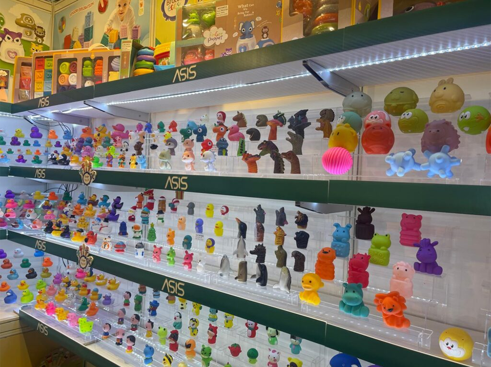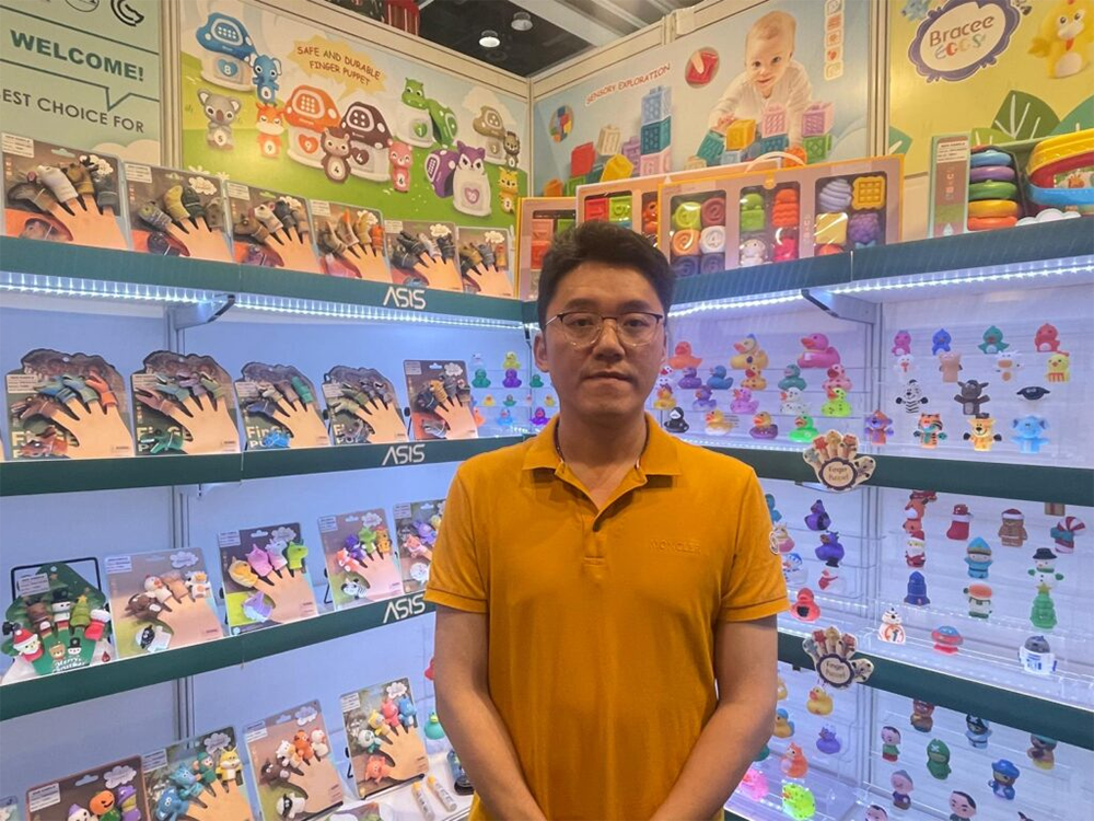 我们采访的另一家展商是Creative Joy International Co.Ltd,该公司产品涵盖软积木、手指玩偶、橡皮鸭等多种玩具,主要销往欧洲国家,包括法国、英国、德国、西班牙和意大利。