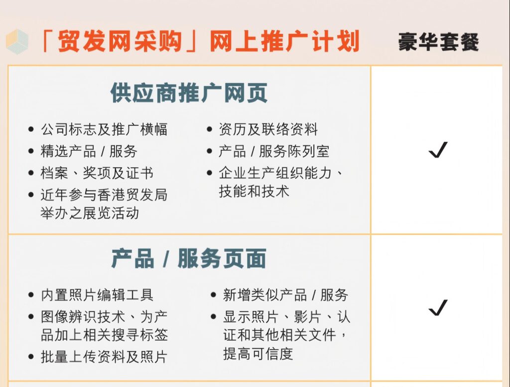 从供应商推广网页提供的“公司标志及推广横幅”服务、“产品/服务陈列室”,到产品/服务页面推出的“内置照片编辑工具”、“批量上传资料及照片”等功能,针对供应商实际运营需求,「贸发网采购」豪华套餐在帮助优化买家浏览体验的同时,为供应商实现曝光度与操作便捷度的双重获益,推进全渠道推广,化流量为订单。
